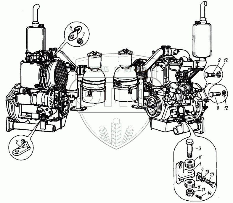 Каталог запасных частей к технике: ВТЗ Т-30A-80. Установка двигателя на трактор