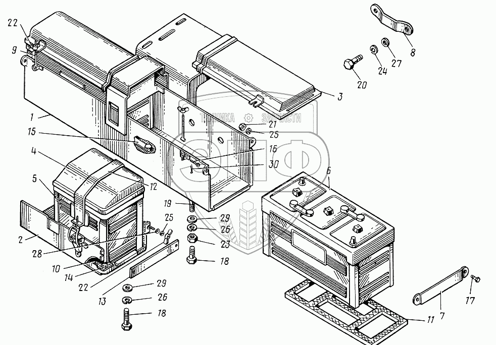 Каталог запасных частей к технике: ЮМЗ-6КЛ, (6КМ). Установка аккумуляторных батарей