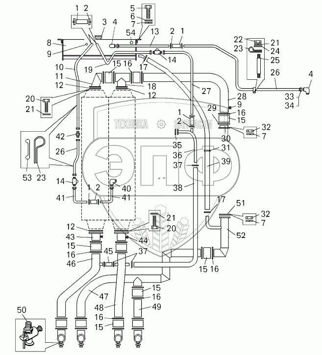 Каталог запасных частей к технике: БелАЗ-7822. Трубопроводы системы охлаждения погрузчика БелАЗ-7822