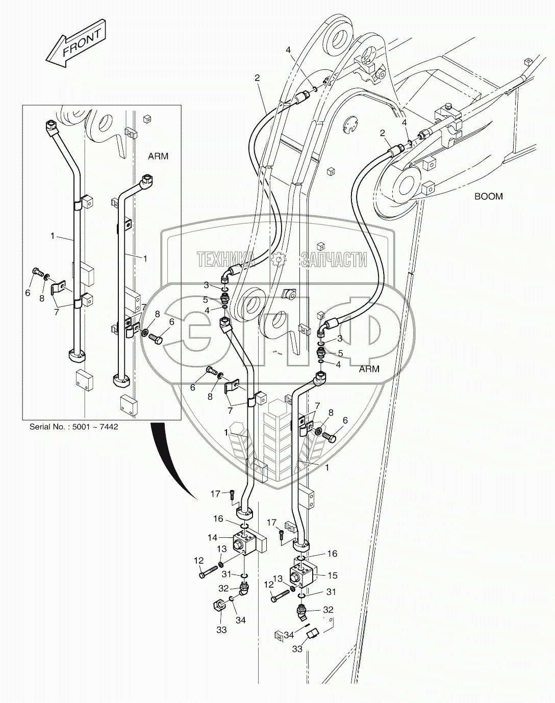 Каталог запасных частей к технике: Doosan DX140W. ARM PIPING 2.5m ROTATING