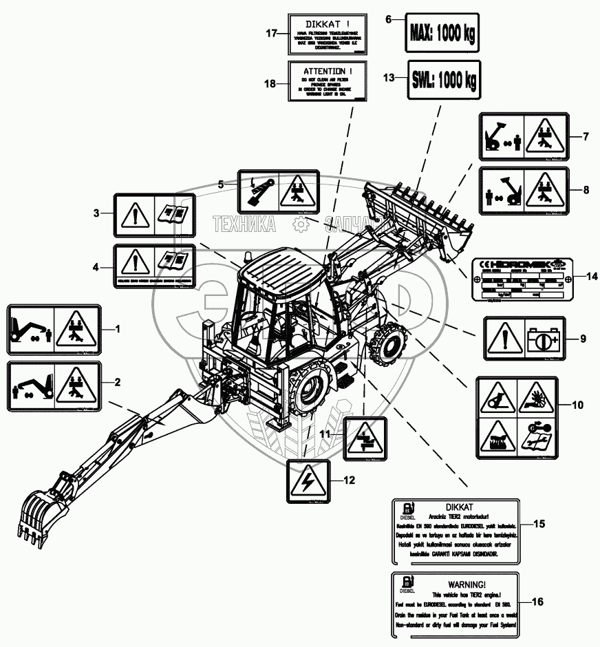 Каталог запасных частей к технике: Hidromek HMK 102B. DECALS, WARNING