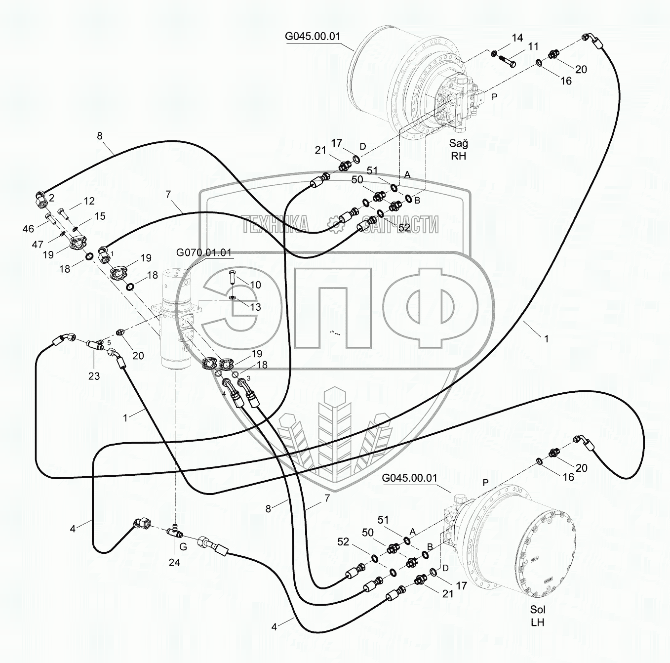 Каталог запасных частей к технике: Hidromek HMK 230LC3. LOWER FRAME HYDRAULIC PIPING, TRAVEL