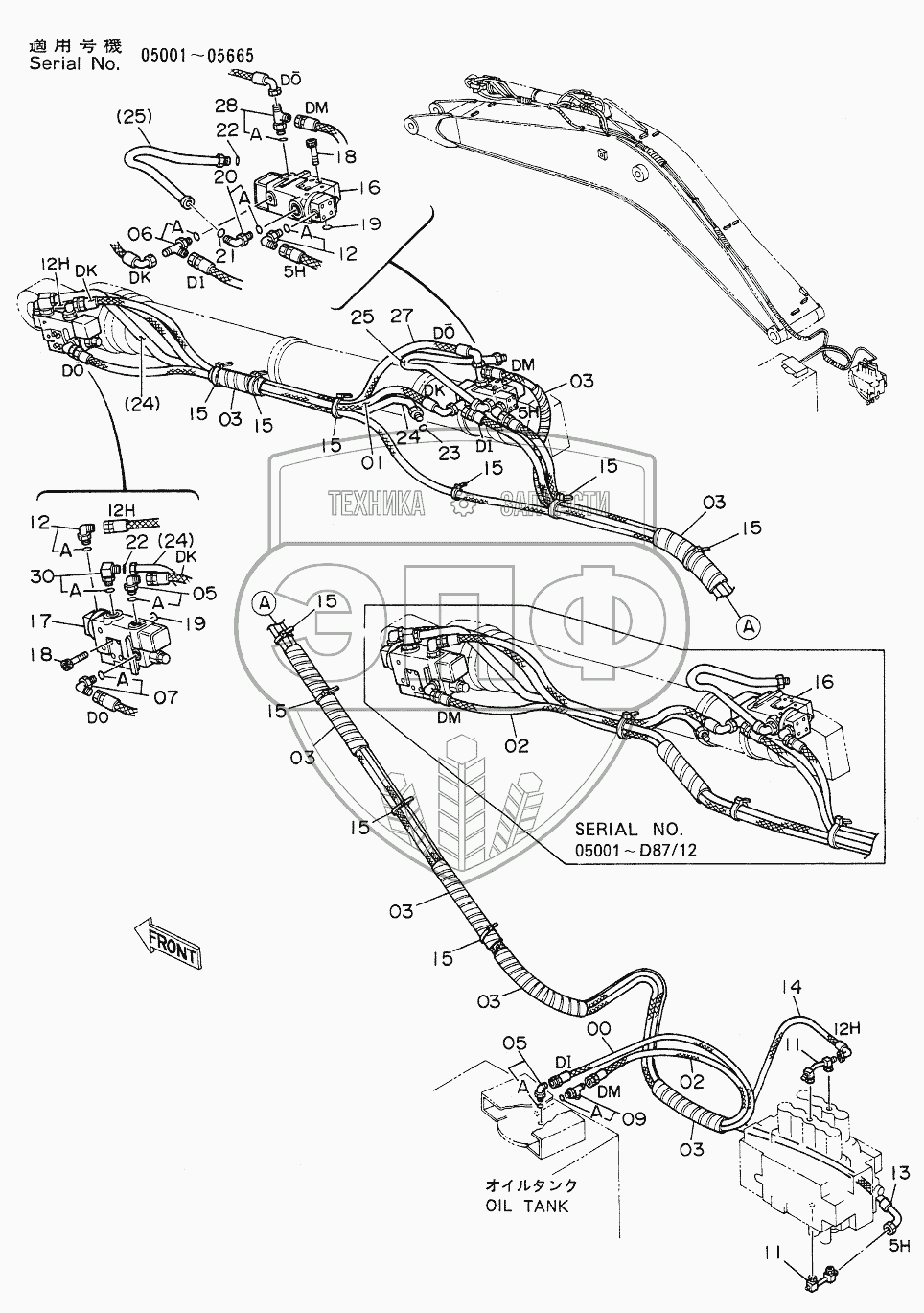 Каталог запасных частей к технике: Hitachi EX-220. HOSE RUPTURE VALVE PIPINGS (ARM)