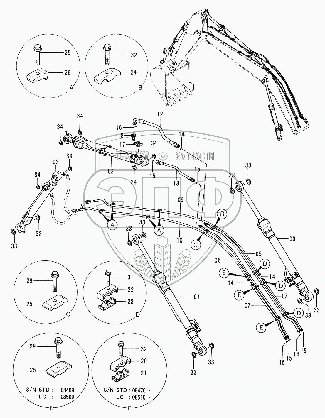 Каталог запасных частей к технике: Hitachi EX-220-2. FRONT PIPINGS (1)