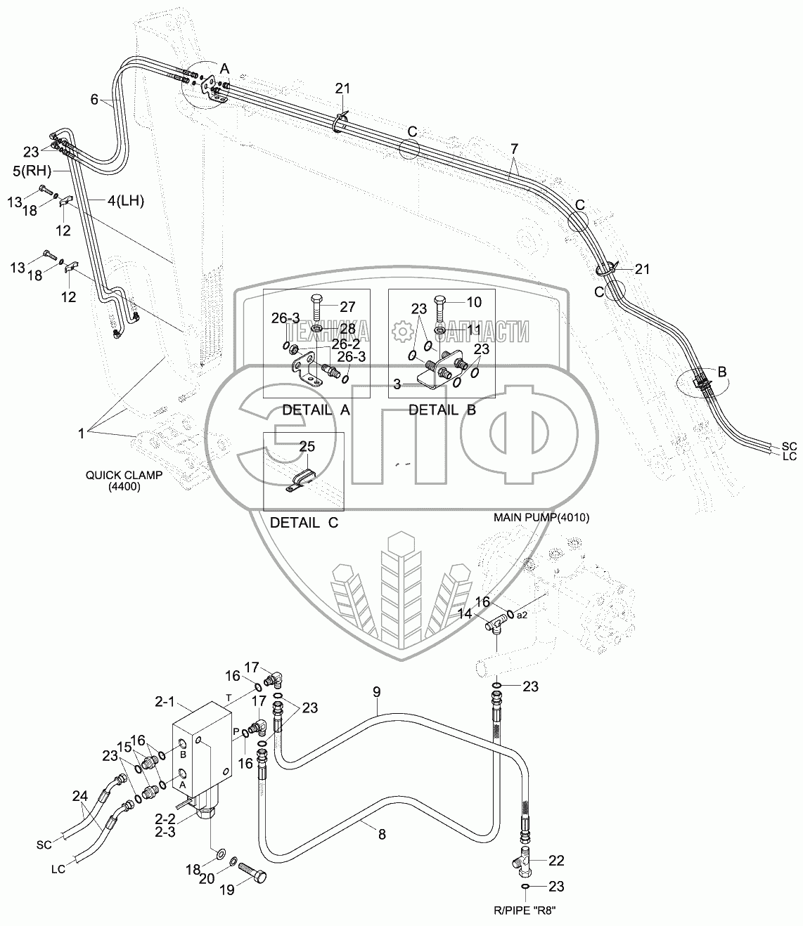 Каталог запасных частей к технике: Hyundai R140W-9. QUICK CLAMP HYD PIPING
