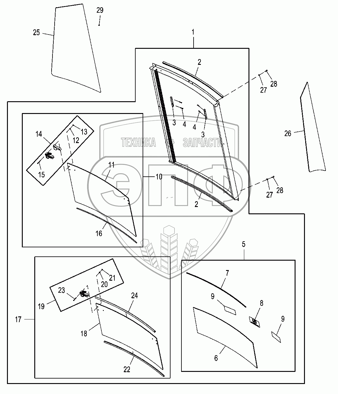 Каталог запасных частей к технике: John Deere JD-315SK(часть 2). Задние окна кабины