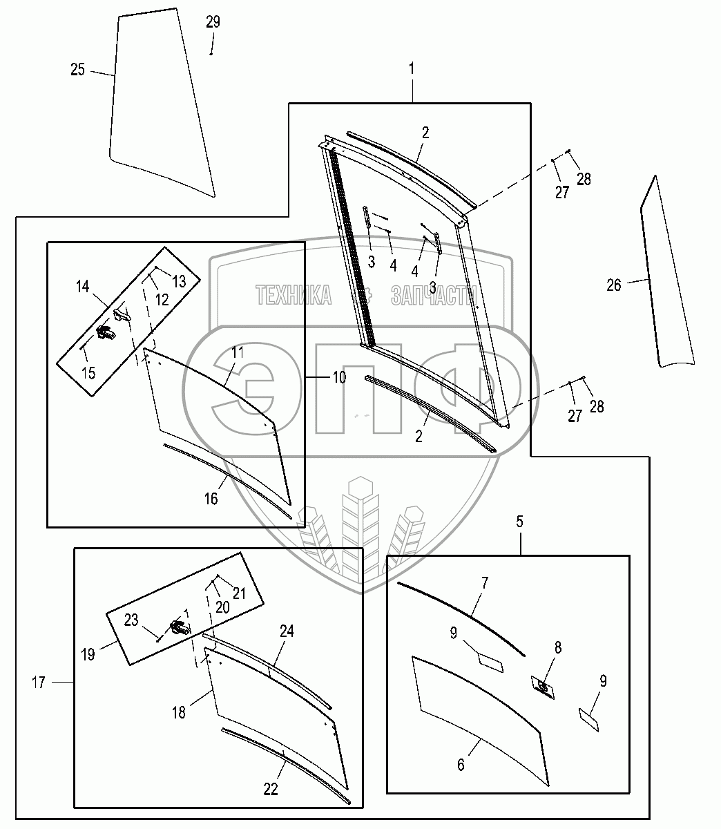 Каталог запасных частей к технике: John Deere JD-325SK. Задние окна кабины