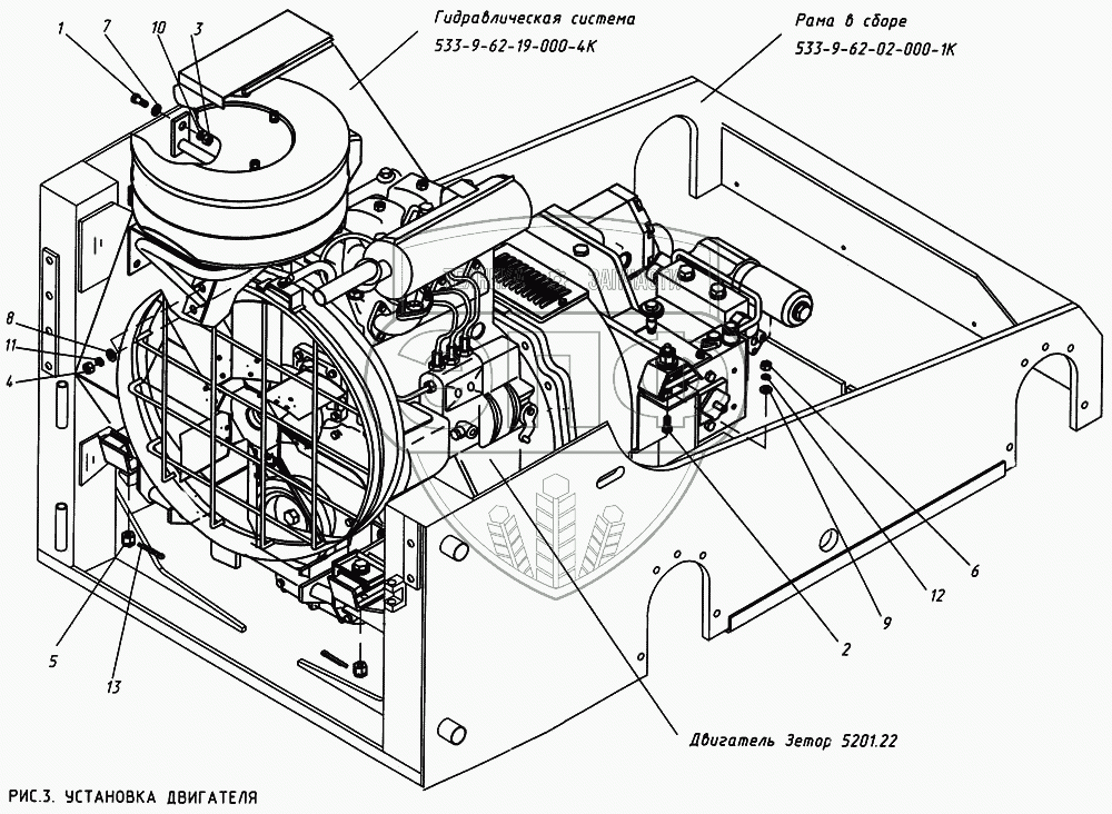 Каталог запасных частей к технике: КМЗ МКСМ-800. Установка двигателя