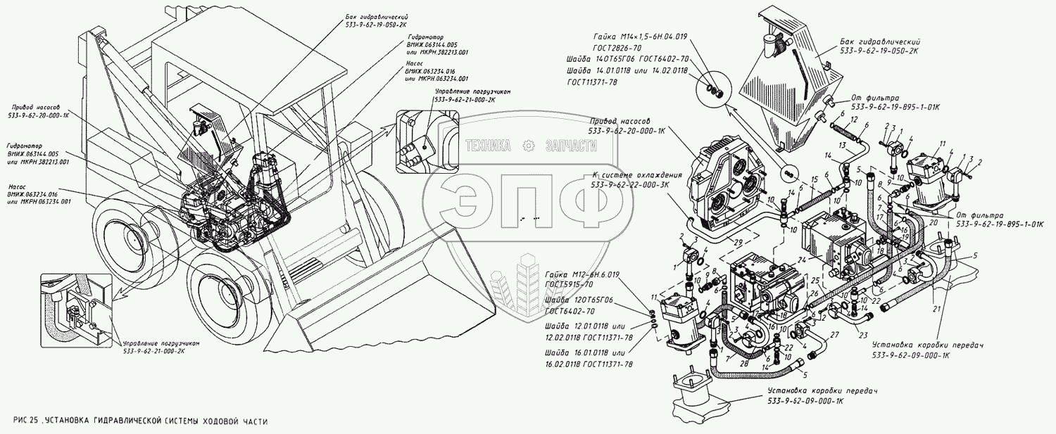 Каталог запасных частей к технике: КМЗ МКСМ-800. Установка гидравлической системы ходовой части