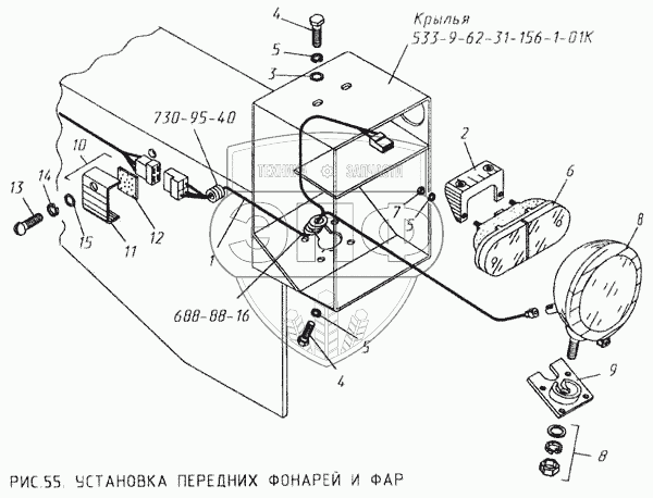 Каталог запасных частей к технике: КМЗ МКСМ-800. Установка передних фонарей и фар