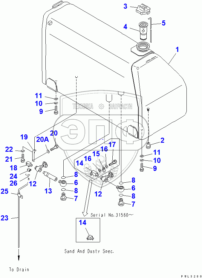 Каталог запасных частей к технике: Komatsu D155C-1P. FUEL TANK(15686-31573)
