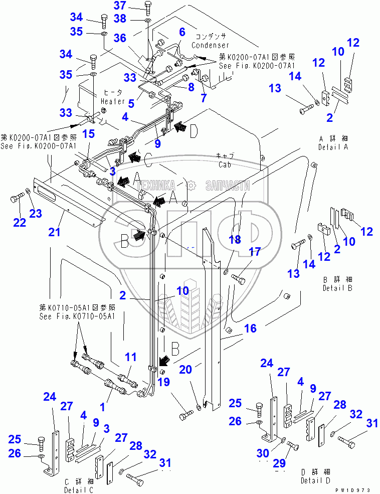 Каталог запасных частей к технике: Komatsu D355C-3. CAB (COOLER PIPING)(14404-)