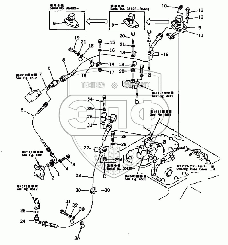 Каталог запасных частей к технике: Komatsu D85A-21B. STEERING PIPING (3/3)(35001-)