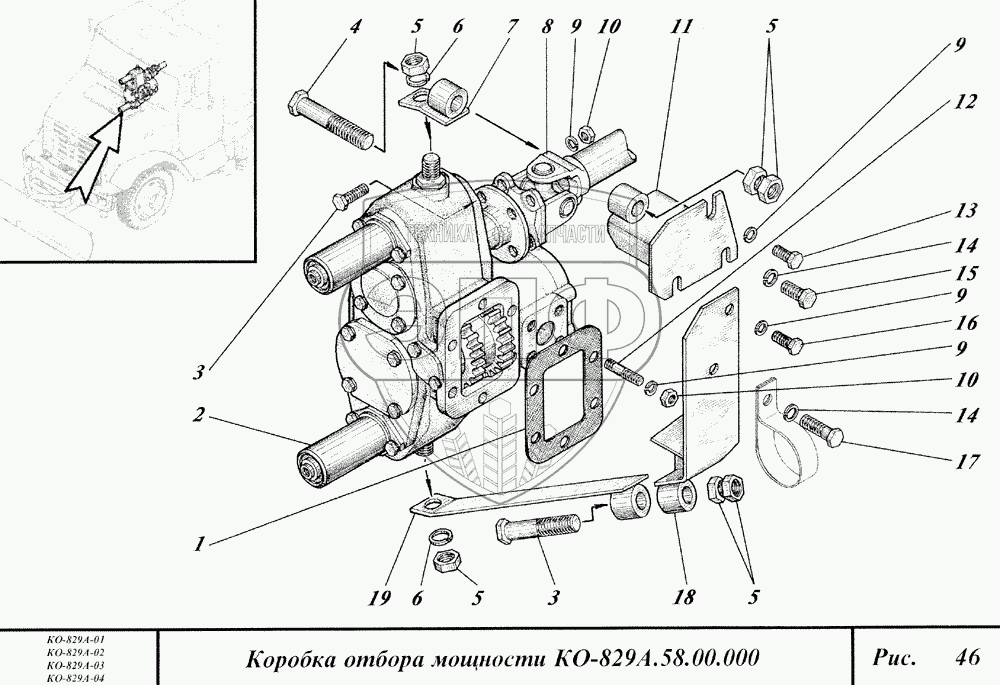 Каталог запасных частей к технике: Коммаш КО-829А. Коробка отбора мощности