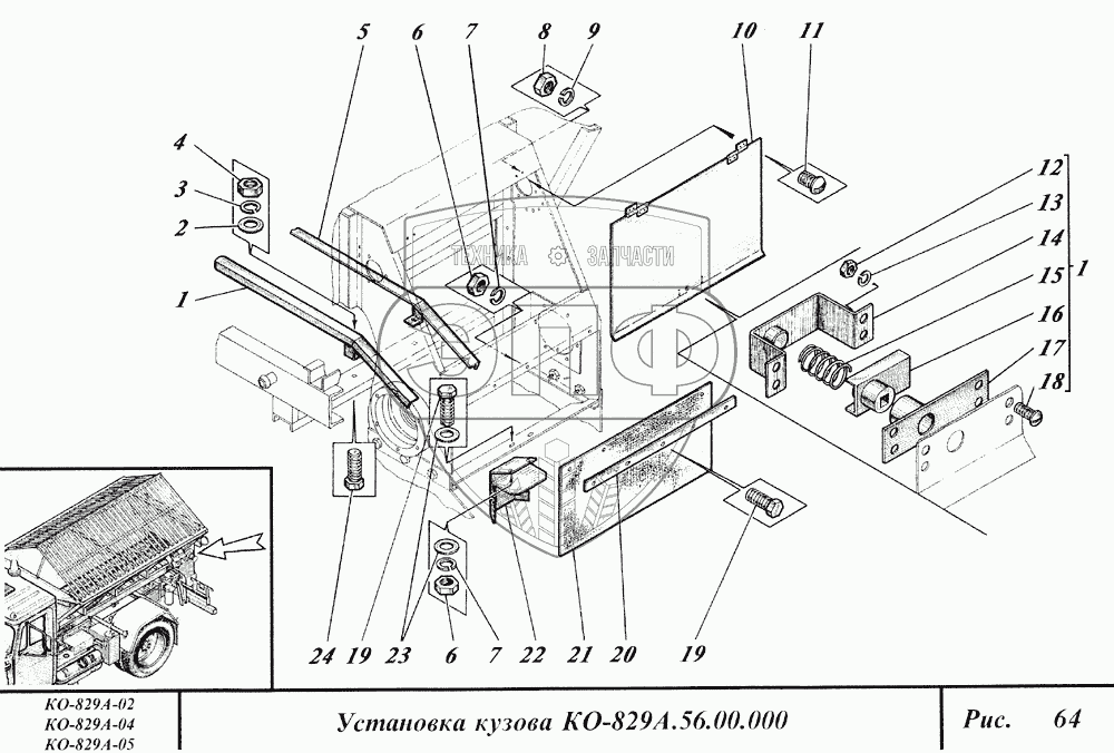 Каталог запасных частей к технике: Коммаш КО-829А. Установка кузова
