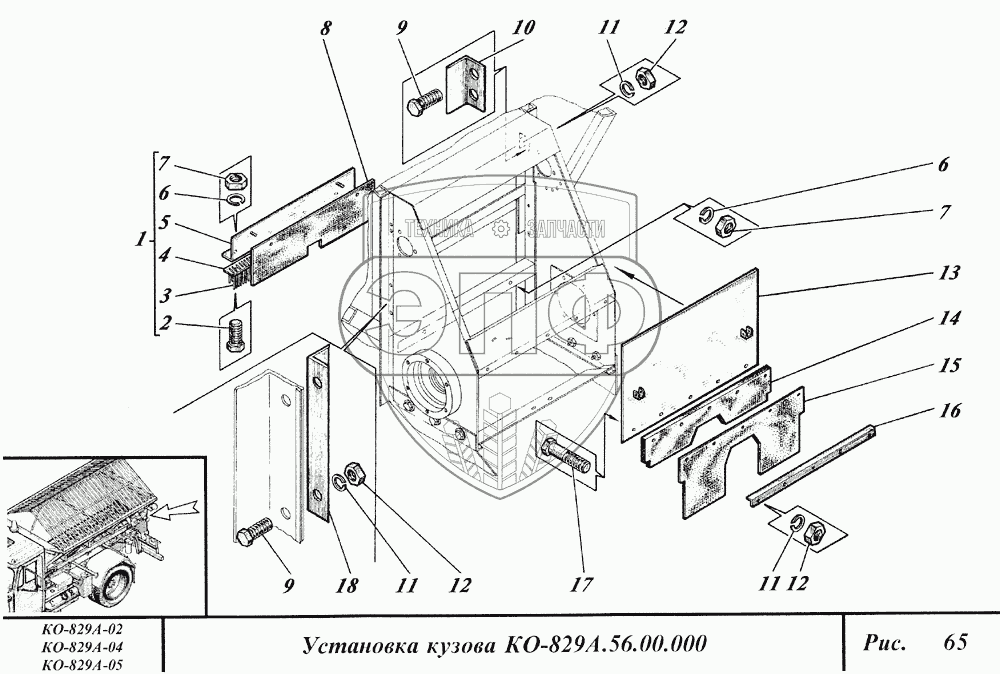 Каталог запасных частей к технике: Коммаш КО-829А. Установка кузова