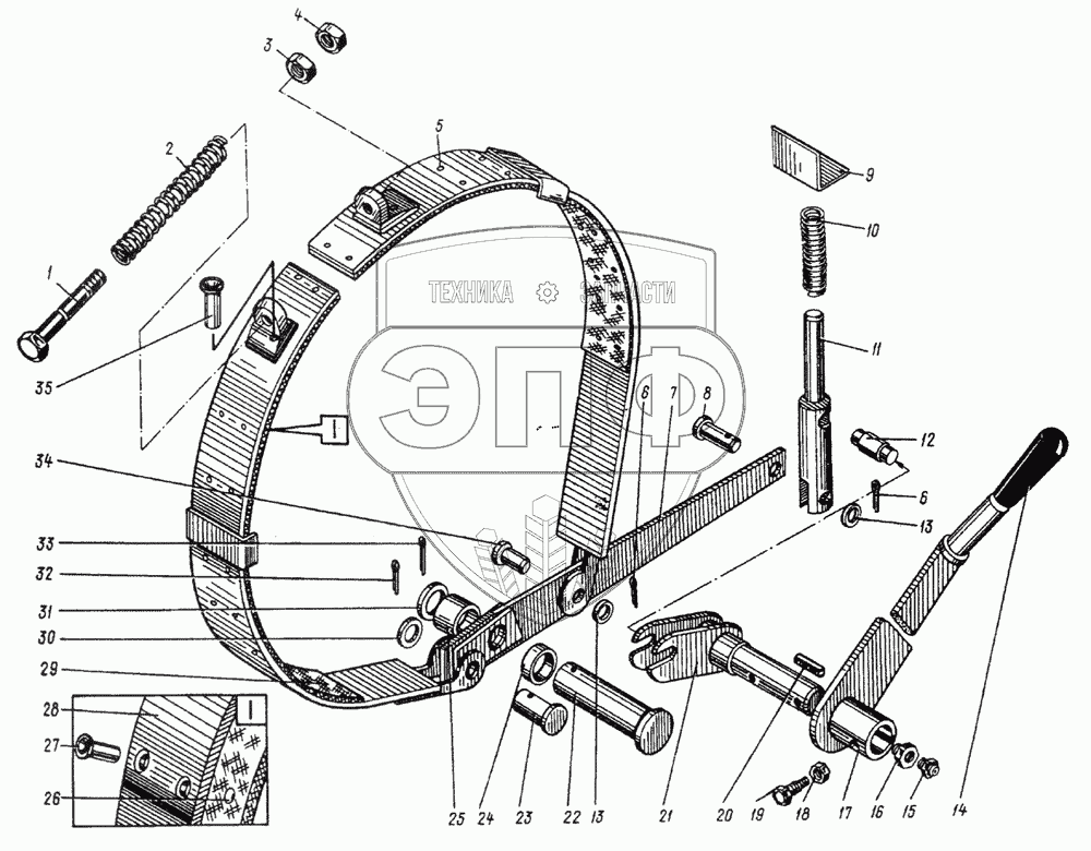 Каталог запасных частей к технике: Ковровец Э-652Б. 652.042 Тормоз стрелоподъемного барабана