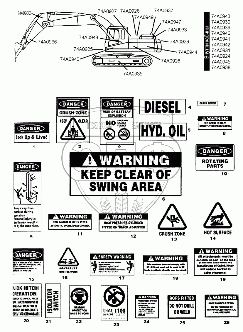 | 8 | 74A0931 | Предупредительная табличка «Не допускать присутствия по- сторонних лиц в кабине» | Нет на складе | |