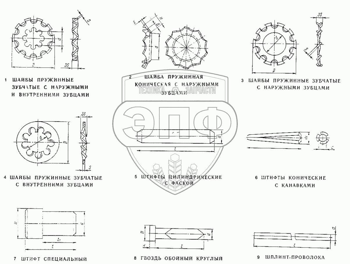 Каталог запасных частей к технике: ЛЗА 4043М. Шайбы, штифты, гвозди, шплинт-проволока
