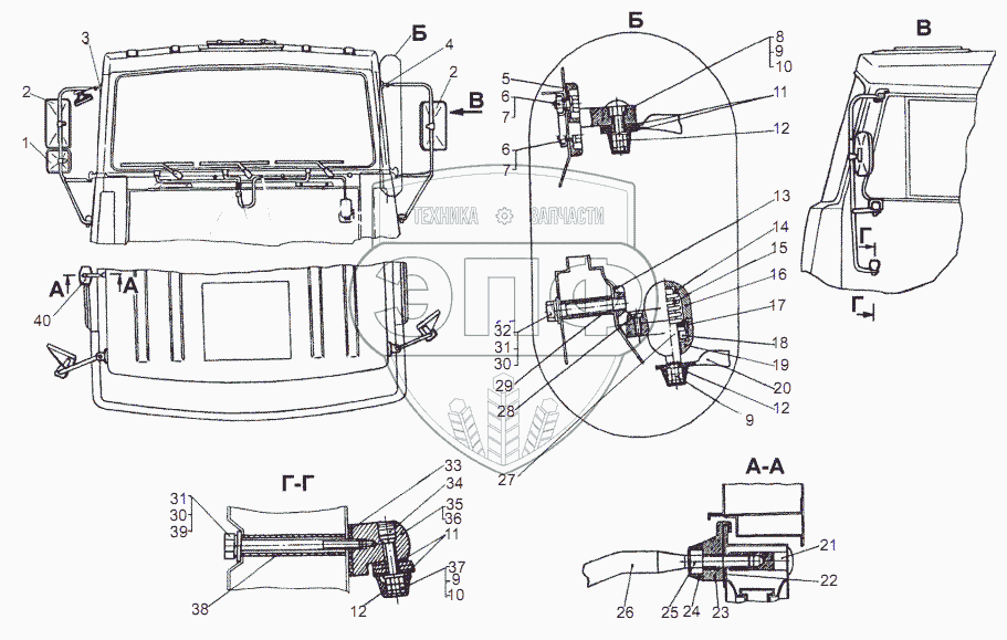 Каталог запасных частей к технике: МЗКТ-69234. Установка держателей зеркал