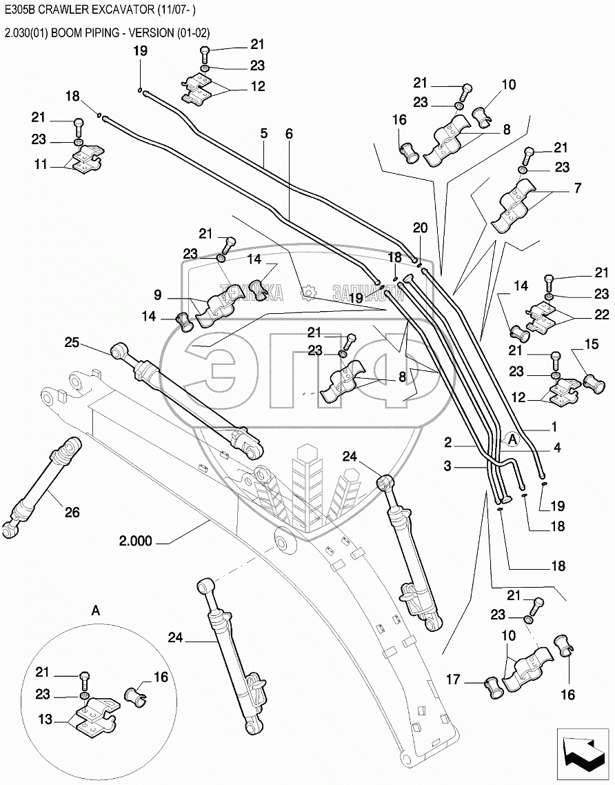 Каталог запасных частей к технике: New Holland Экскаватор E305B. Трубопроводы стрелы