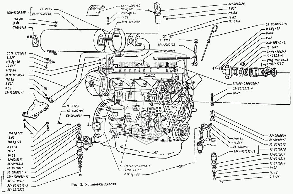 Каталог запасных частей к технике: Онежец ТДТ-55А. Установка дизеля