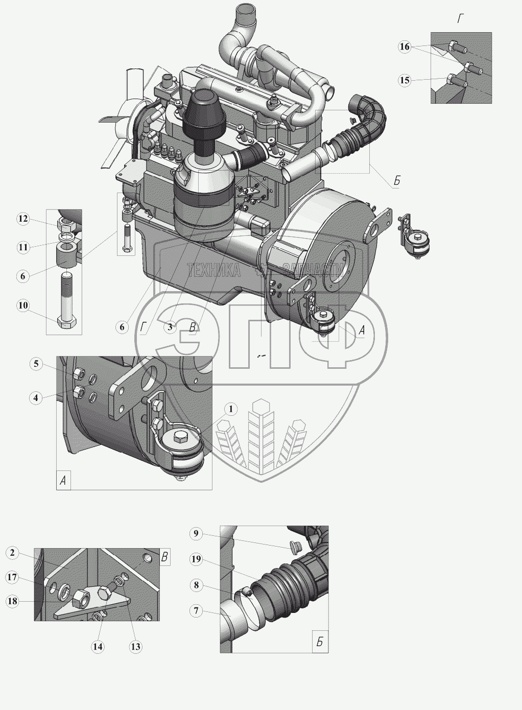 Каталог запасных частей к технике: ПАО "ТЗА" Автобетоносмеситель 58149Z. Установка двигателя