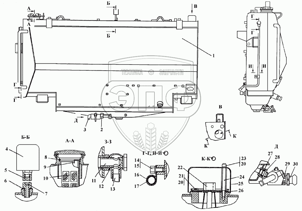 Каталог запасных частей к технике: Промтрактор Шасси ТП-20.02. Бак топливный