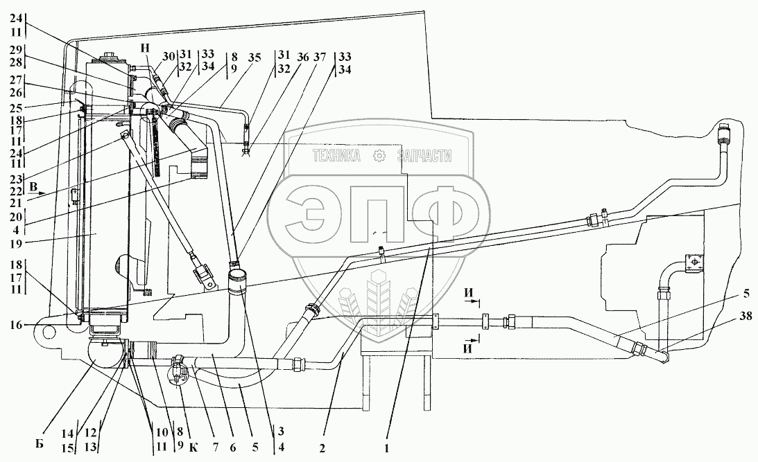 Каталог запасных частей к технике: Промтрактор ТГ-221КМ. Система охлаждения двигателя и трансмиссии