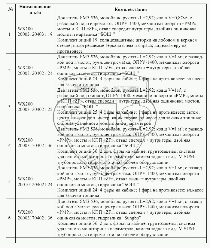 Каталог запасных частей к технике: ТВЭКС WХ-200 (2017). Исполнения экскаваторов WХ200